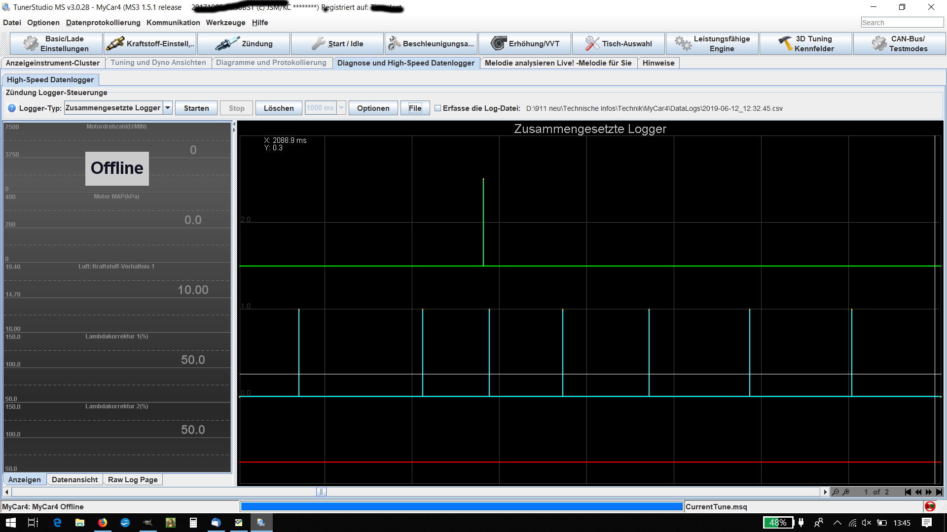 Na das sieht doch ordentlich aus Zoome mal in deinen Log und schau, dass das Cam Signal sauber zwischen zwei KW-Balken kommt. Ich hatte mal das Problem, dass beide annähernd aufeinander fielen, dann wollte der Motor nicht starten. Seitdem richte ich den NW-Sensor immer penibel mittig aus.