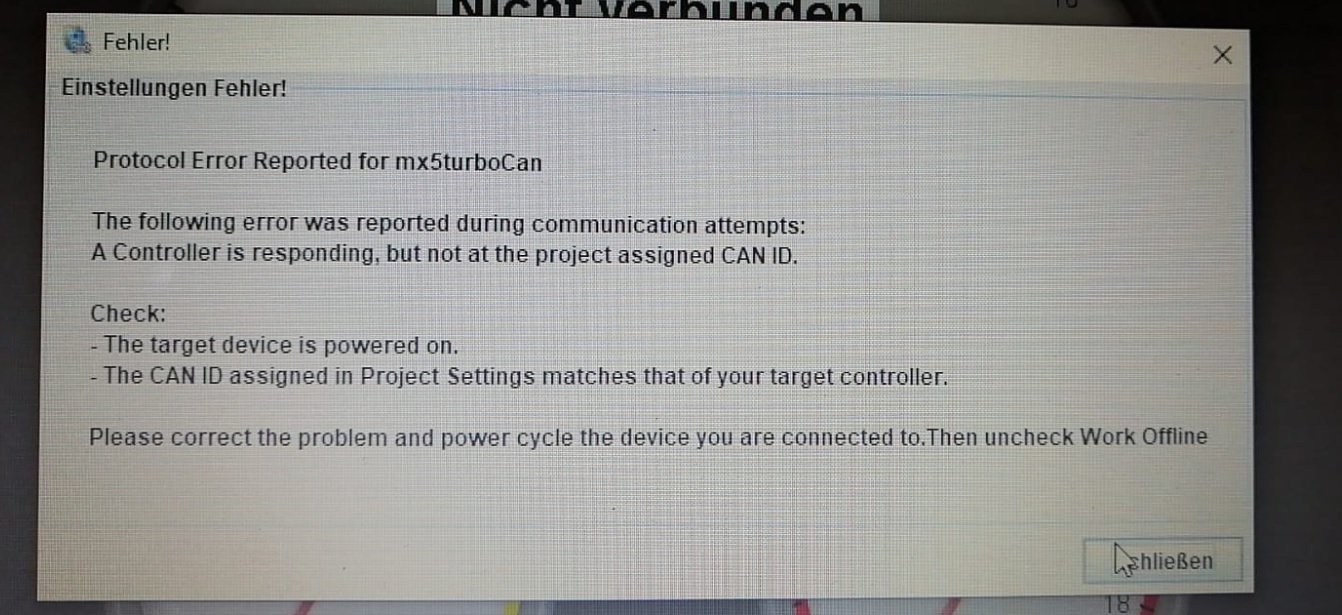Wir hatten zwischenzeitlich zumindest wieder Zugriff auf die MS, irgendwas scheint dann aber mit den CAN Einstellungen falsch gelaufen zu sein, denn jetzt gibt es keine Verbindung mehr. Auch nicht mehr mit zuvor verwendeten Projekt das immer funktioniert hatte.