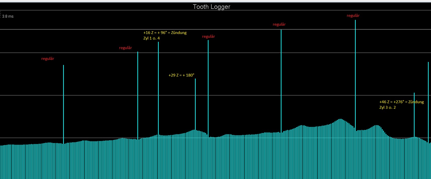 Ich habe das Problem, dass die Zündung massiv aufs VR-Signal schlägt. Gutes Signal habe ich, wenn die Zündung abgeklemmt ist. Sobald ich starten will, und der Motor zündet / verbrennt / Drehzahl gewinnt, kommt ein Lost Sync nach den anderen. Mit dem Tooth Logger sieht man deutlich, dass das zu Zeitpunkten ist, wo ein Zyl zündet. OT ist 16 Zähne nach der Lücke. Provozieren konnte man dies deutlich, wenn Zündkerzen mit größerem Elektrodenabstand eingebaut werden.