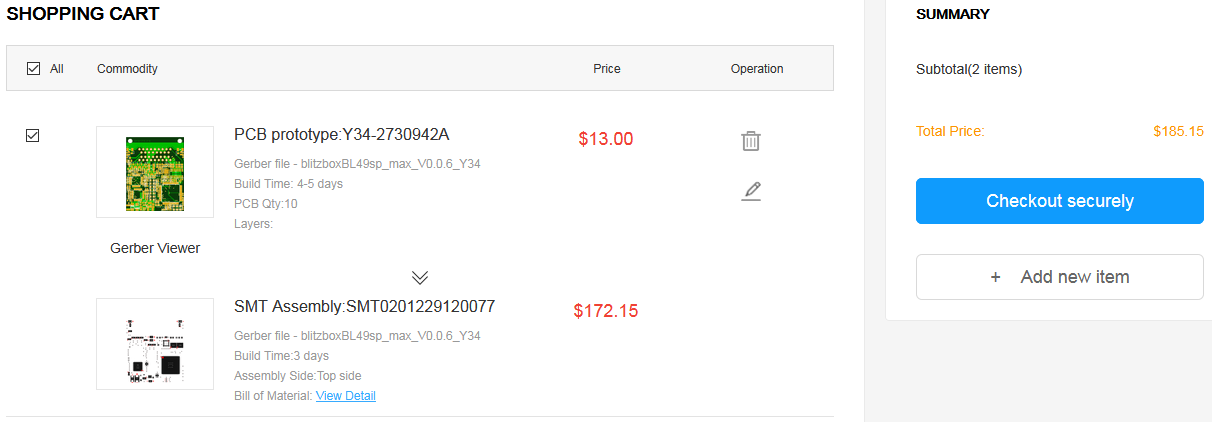 10 bestückte Platinen inkl. Versand und Verzollung: 231 US$ entspricht ca. 189 Euro (da fehlen jetzt ca. 4 Dollar, weil ein Baustein mal wieder nicht lieferbar ist)