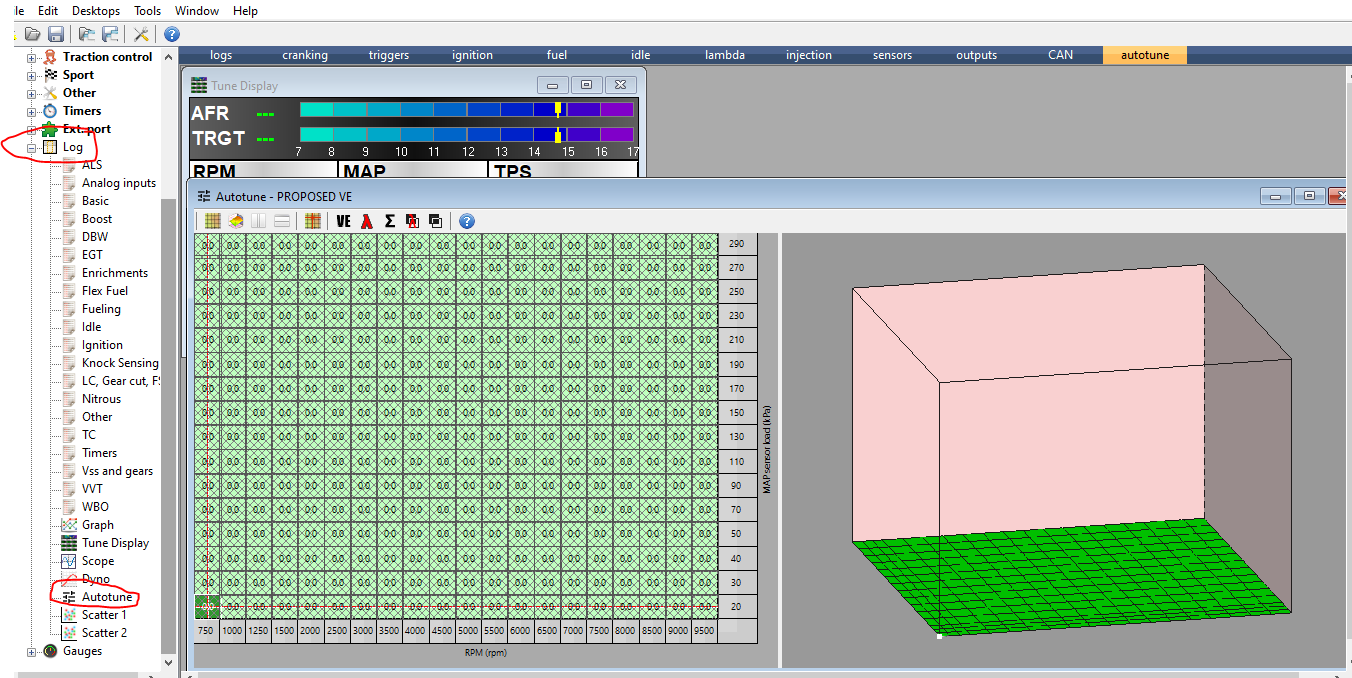 Während der Fahrt (als Mitfahrer) habe ich die Werte direkt ins VE table geschrieben. Unter Tools -> Customize keys findet man auch Autotune shortcuts ( z.B. Autotune VE table Cell: K). Ich habe während der Fahrt mit "K" bzw. "S" und "Alt+S" die Werte in die Tabelle geschrieben.