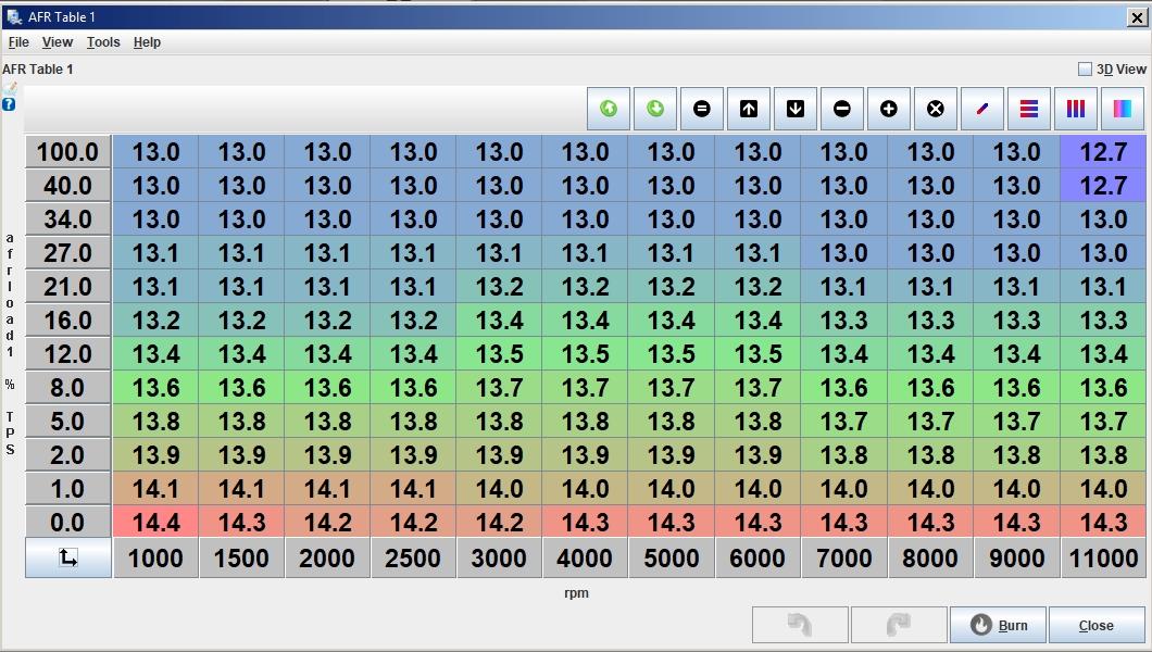 Nun tuckert der Motor bei knapp 1000U/min vor sich hin und die AFR-Anzeige schwankt so bei 14:1, also im leicht fetten Bereich. Aber hinter dem Auto riecht es dennoch stark nach sehr fett und beim Fahren braucht es unsagbar viel Benzin. Das hat mich zu der Frage nach der AFR-Tabelle gebracht, die ja nun Basis für einen guten Lambdawert und das Fahren mit Live-Tuning sein soll- glaube ich zumindest bis jetzt noch.