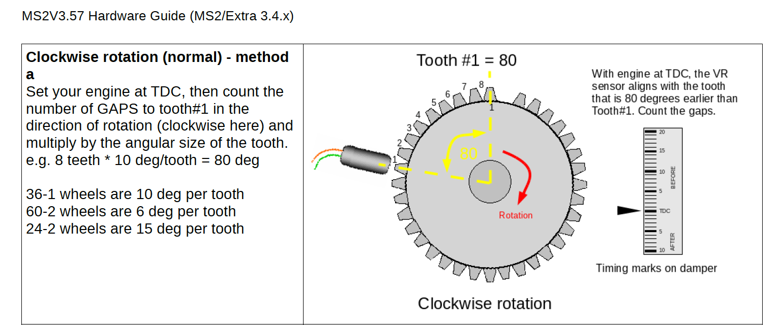 Am leichtesten ist es den Zylinder 1 auf OT (TDC) zu bringen und da sollte der Hall- oder VR-Sensor auf den 8. bzw. 9. Zahn (Tooth) treffen und das entspricht dann auch der empfohlenen Lücke 90° vor OT beim 4-Zylinder