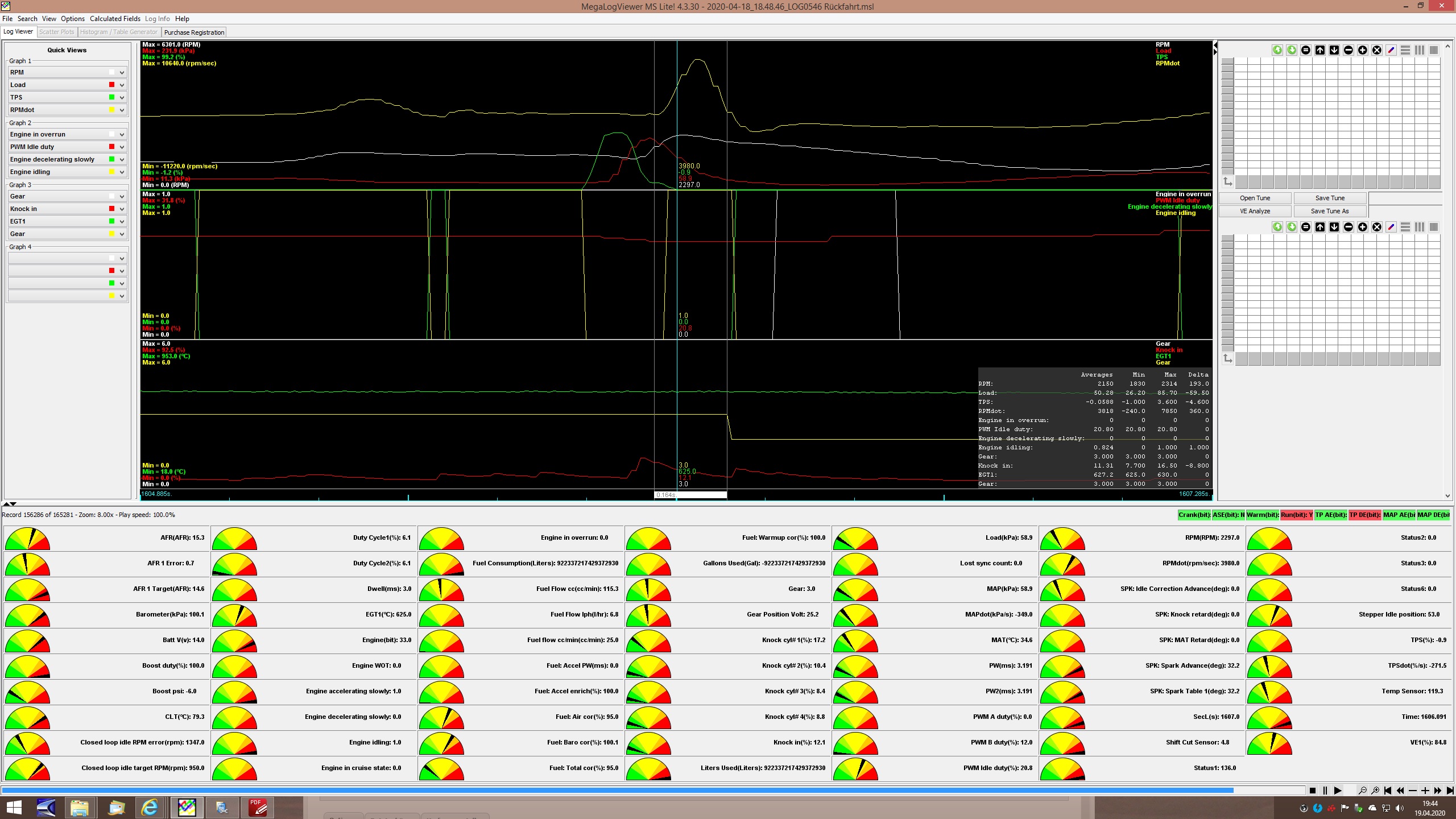 AFR wird kurz fett, dann mager und dann wieder normal. Also wird irgendwas im VE Tbl nicht passen, obwohl ich heute nochmal alles unten mit Autotune sauber abgefahren und dann geglättet habe.